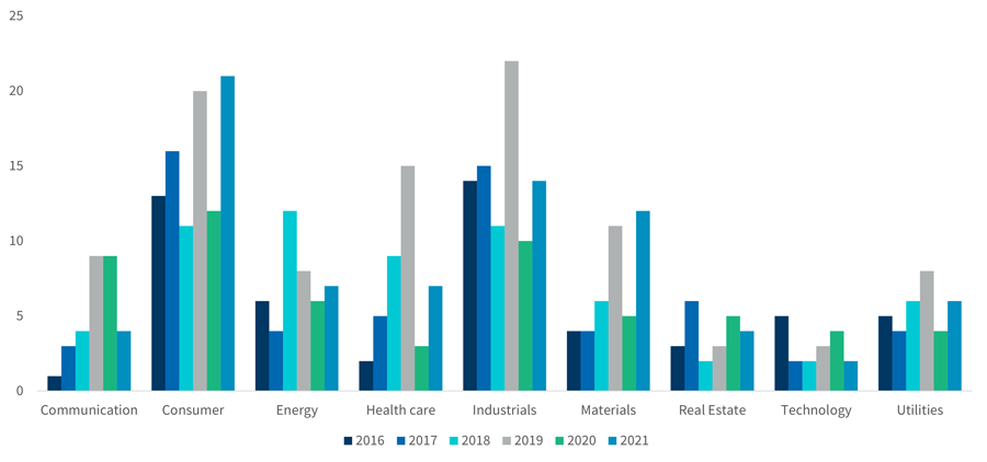 M&A activity slightly improved in FY21 but remains below historical levels. Earlier in the year, the country experienced a wide range of protests5, which may have affected transaction activity. Elections in the latter half of 2022 could provide some optimism. FY21 activity has been driven by deals in the industrials and consumer sectors.